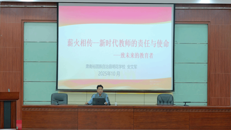 10月20日,太阳集团tyc151邀请全国优秀教师、肃南县明花中学安文军老师作了题为“薪火相传——新时代教师的责任与使命”的报告。学院教师、教育硕士研究生及数学与应用数学专业200多名学生参加报告会。